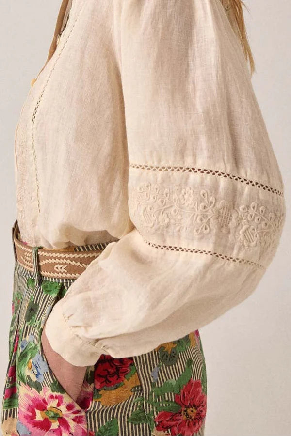 Camicetta rilassata in misto cotone-lino con delicati dettagli ricamati. Colletto classico, davanti con bottoni, maniche lunghe con volume delicato. Cotone-lino traspirante e fresco, la trama naturale migliora con l'usura.