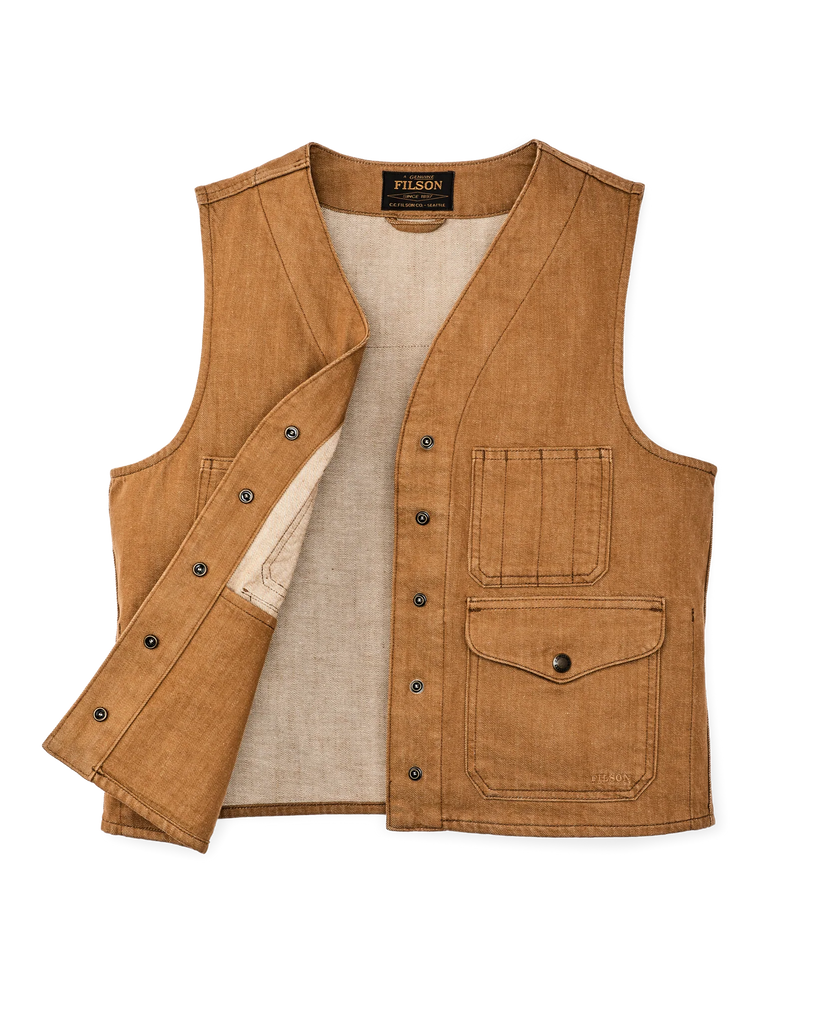 True to its workwear roots, the vest features flapped cargo pockets, open-stow chest pockets, and a full-width rear pocket originally designed to carry maps and charts. A snap-front closure and V-neck cut keep the fit clean and practical.