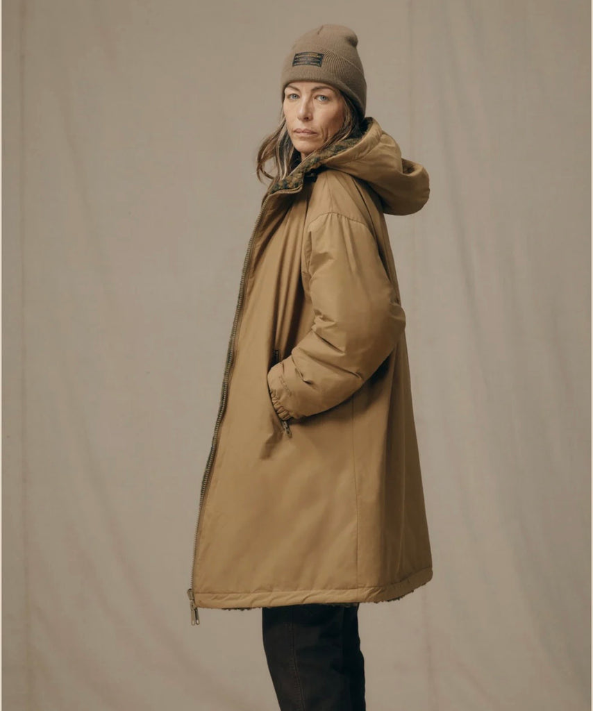 Costruito per le giornate fredde che richiede una copertura extra, questo cappotto estende il calore alle ginocchia. È completamente reversibile, con un lato in alto pile misto lana per l'isolamento e l'altro in cotone intrecciato strettamente per bloccare il vento.