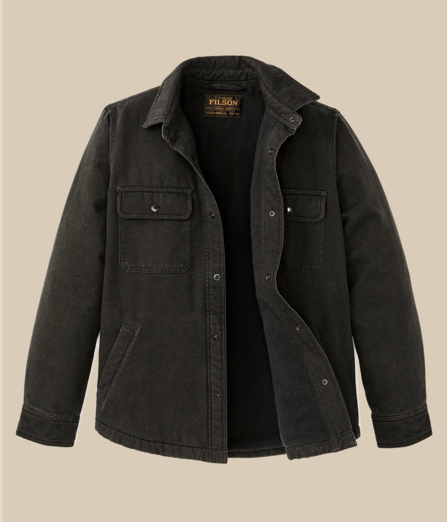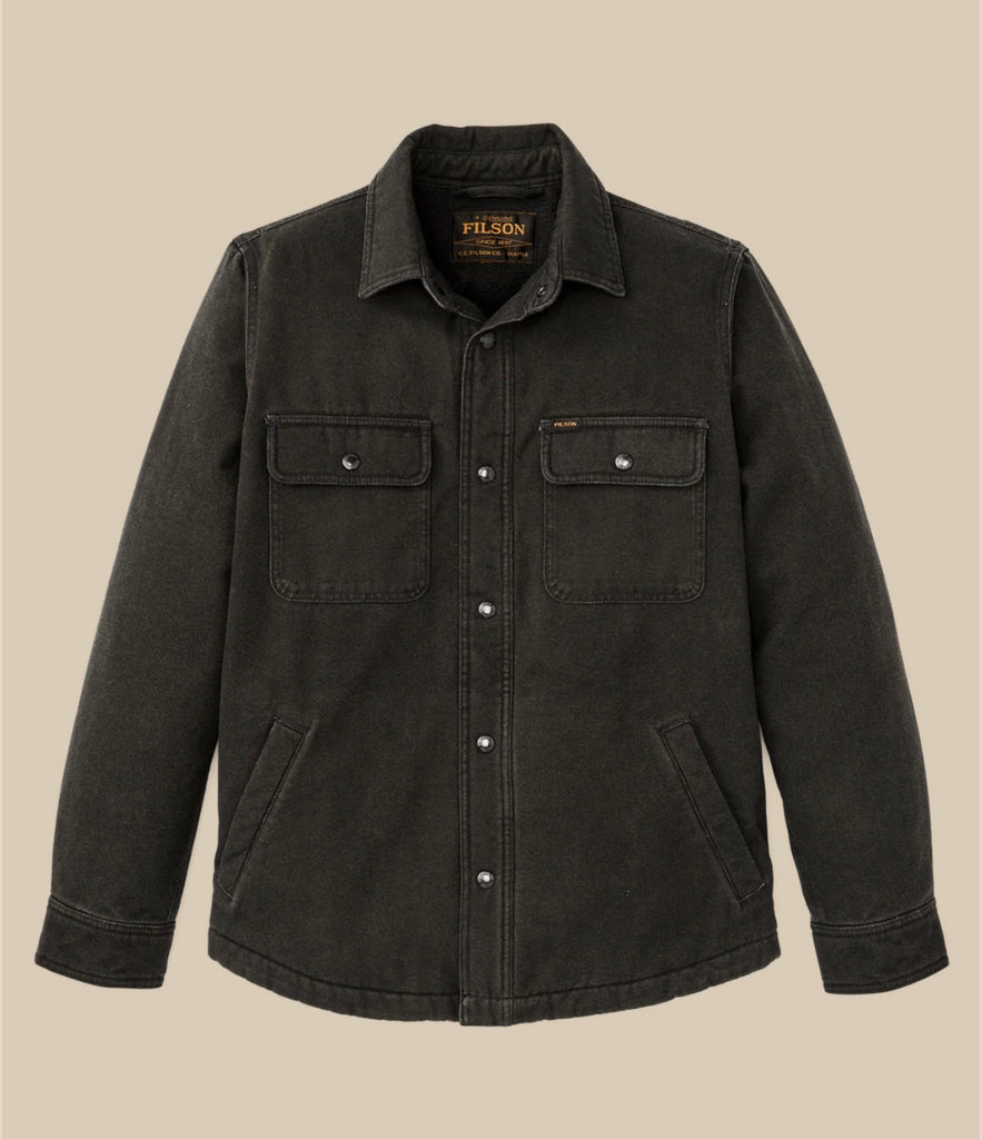 Filson pinza con isolamento per il clima più freddo. è costruito con robusta tela di cotone da 10 once per anni di servizio affidabile e foderato con pile nel corpo e polyfill nelle braccia. Indumento lavato per una sensazione ben consumata dal primo