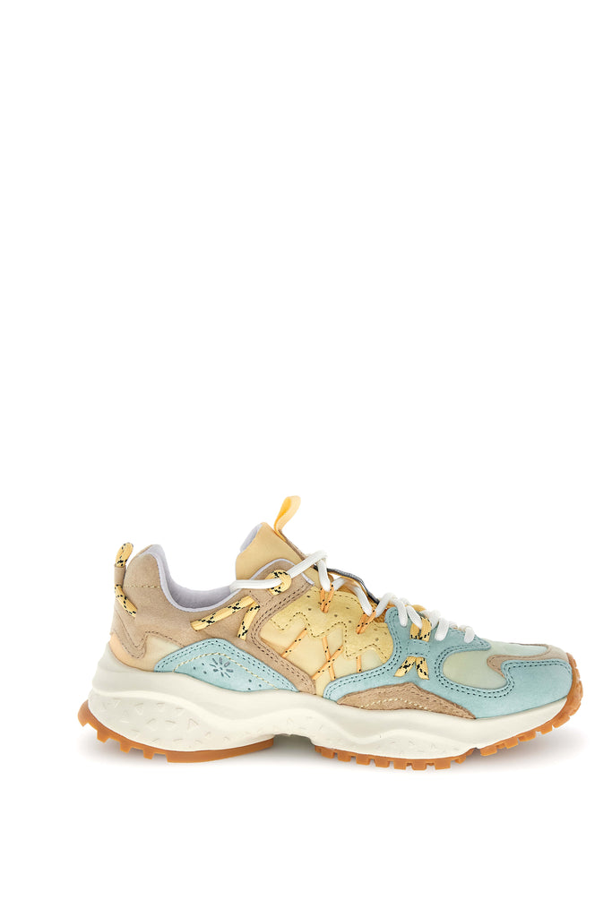 Sneaker in tessuto tecnico con inserti in suede multicolor. Occhielli rinforzati e lacci trek. Soletta interna in sughero naturale antibatterico, fondo in gomma ultra leggera con battistrada dentellato.