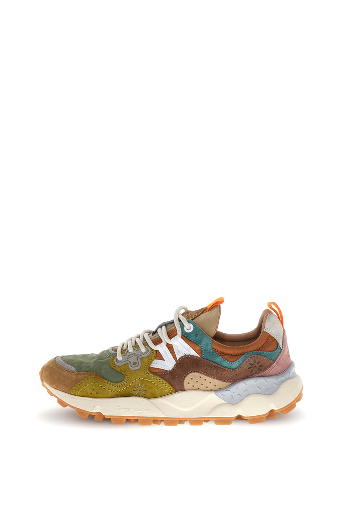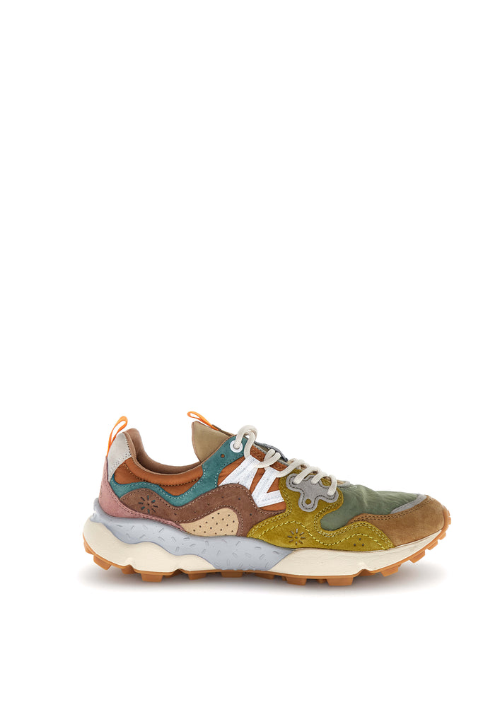 Sneaker in tessuto tecnico con inserti in suede multicolor. Occhielli rinforzati e lacci trek. Soletta interna in sughero naturale antibatterico, fondo in gomma ultra leggera con battistrada dentellato.