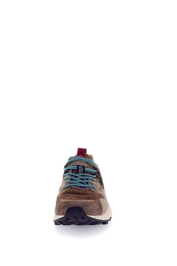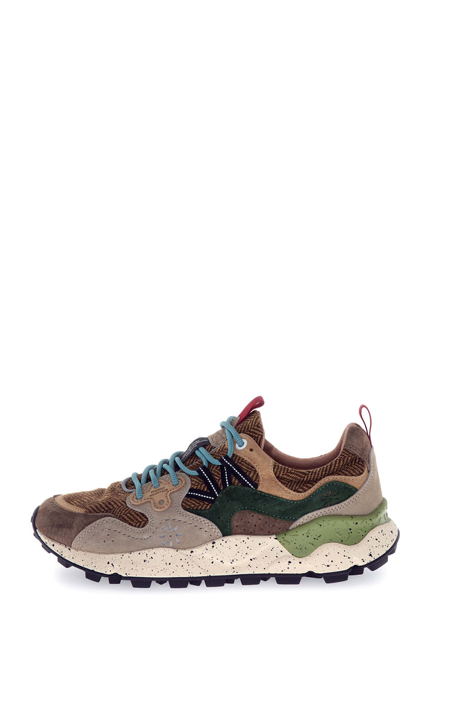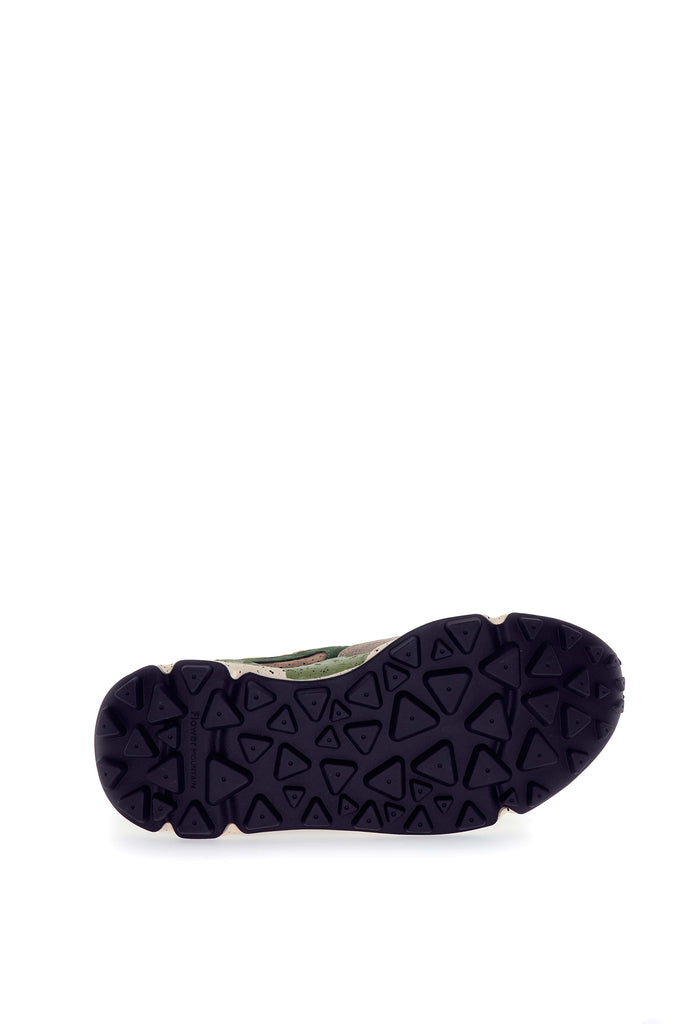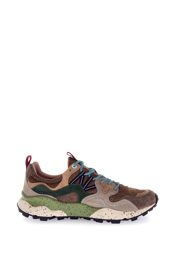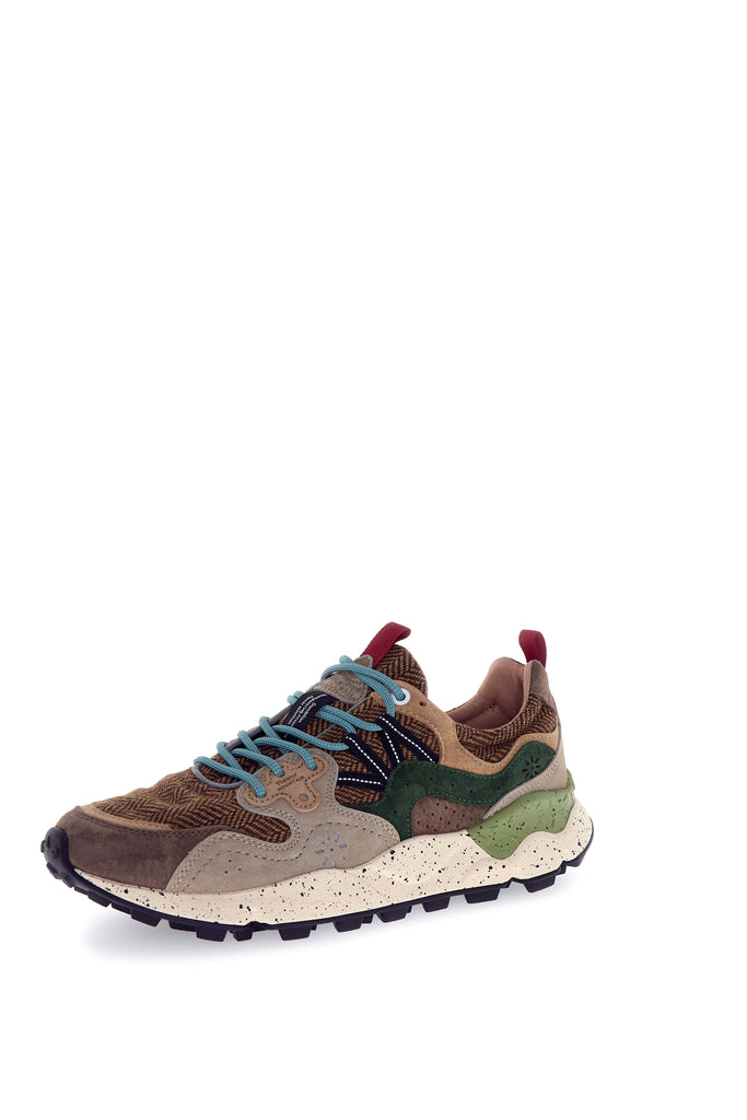 Sneaker in tessuto tecnico con inserti in suede multicolor. Occhielli rinforzati e lacci trek. Soletta interna in sughero naturale antibatterico, fondo in gomma ultra leggera con battistrada dentellato.
