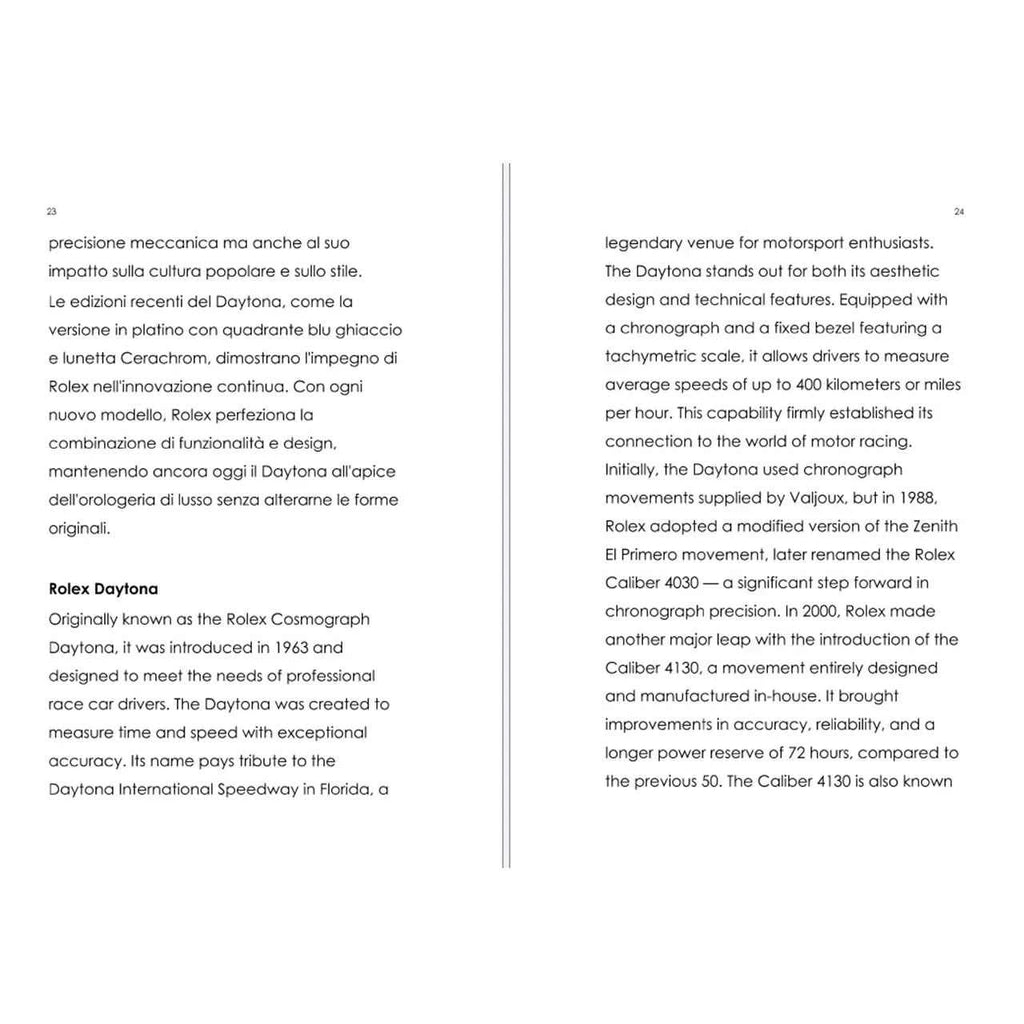 in 22 capitoli monografici dedicati ai modelli più iconici di Rolex, Omega, Patek Philippe, Cartier e molti altri. The Watch Book ripercorre la storia, il design e le innovazioni che hanno reso questi orologi simboli di stile, precisione e avventura. Immagini a colori, testi in Italiano ed Inglese.