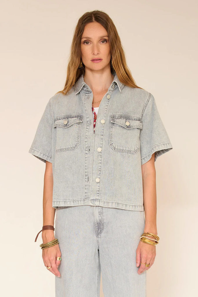 Un denim chiaro dall'aspetto leggermente sbiadito, perfetto per l'estate. Il taglio è dritto e un po' accorciato, con maniche corte che danno una silhouette pulita e moderna. Il caduto è strutturato senza essere rigido, facile da indossare tutti i giorni. Un capo casual e versatile, da abbinare in total look denim o semplicemente con jeans o pantaloncini per un look estivo rilassato e attuale.