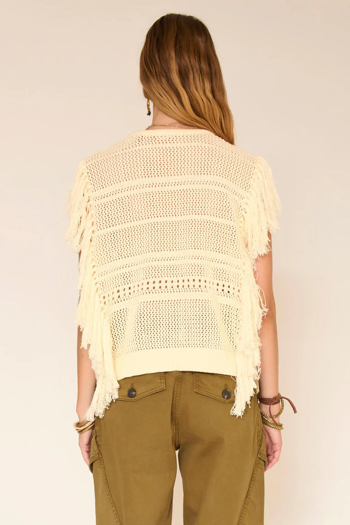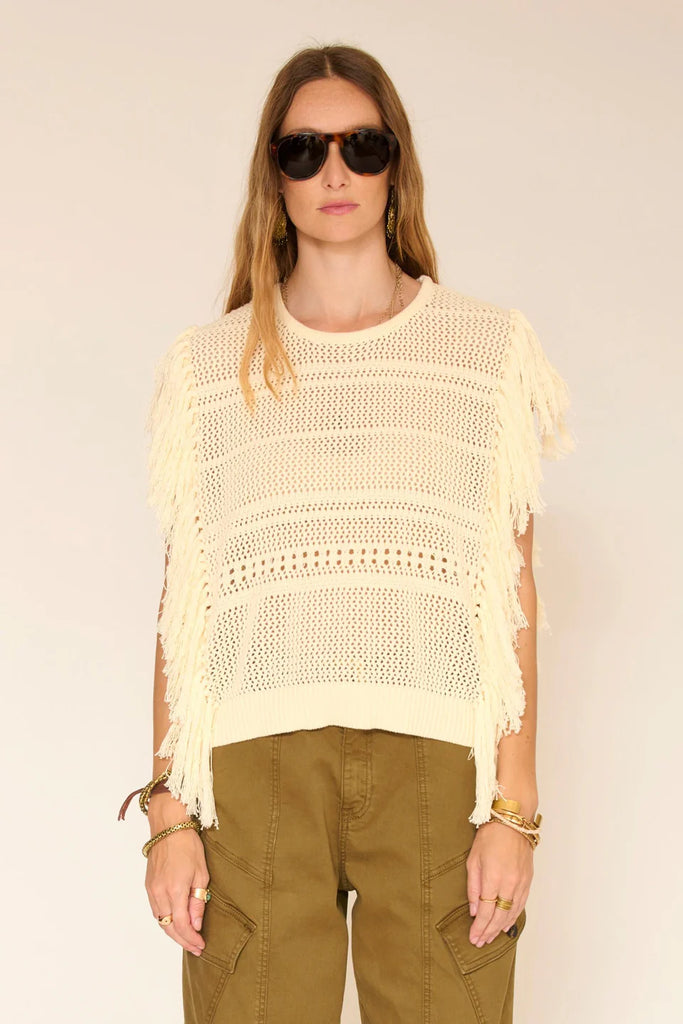Le frange portano movimento e danno subito rilievo alla silhouette. La maglia traforata lascia passare la luce e crea un gioco di texture leggero, perfetto per la stagione. Facile da sovrapporre o da indossare da solo, questo maglione gioca l'equilibrio tra spirito bohémien e look rilassato, senza mai esarcare.