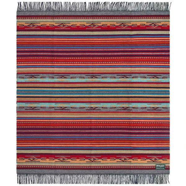 Una coperta in pura lana vergine made in America con una fusione di motivi spagnoli e di ispirazione navajo per onorare le tradizioni tessili del sud-ovest. Luminoso, vivido, morbido e denso. Misure 152x167cm